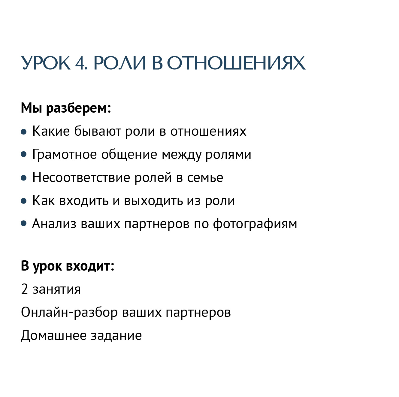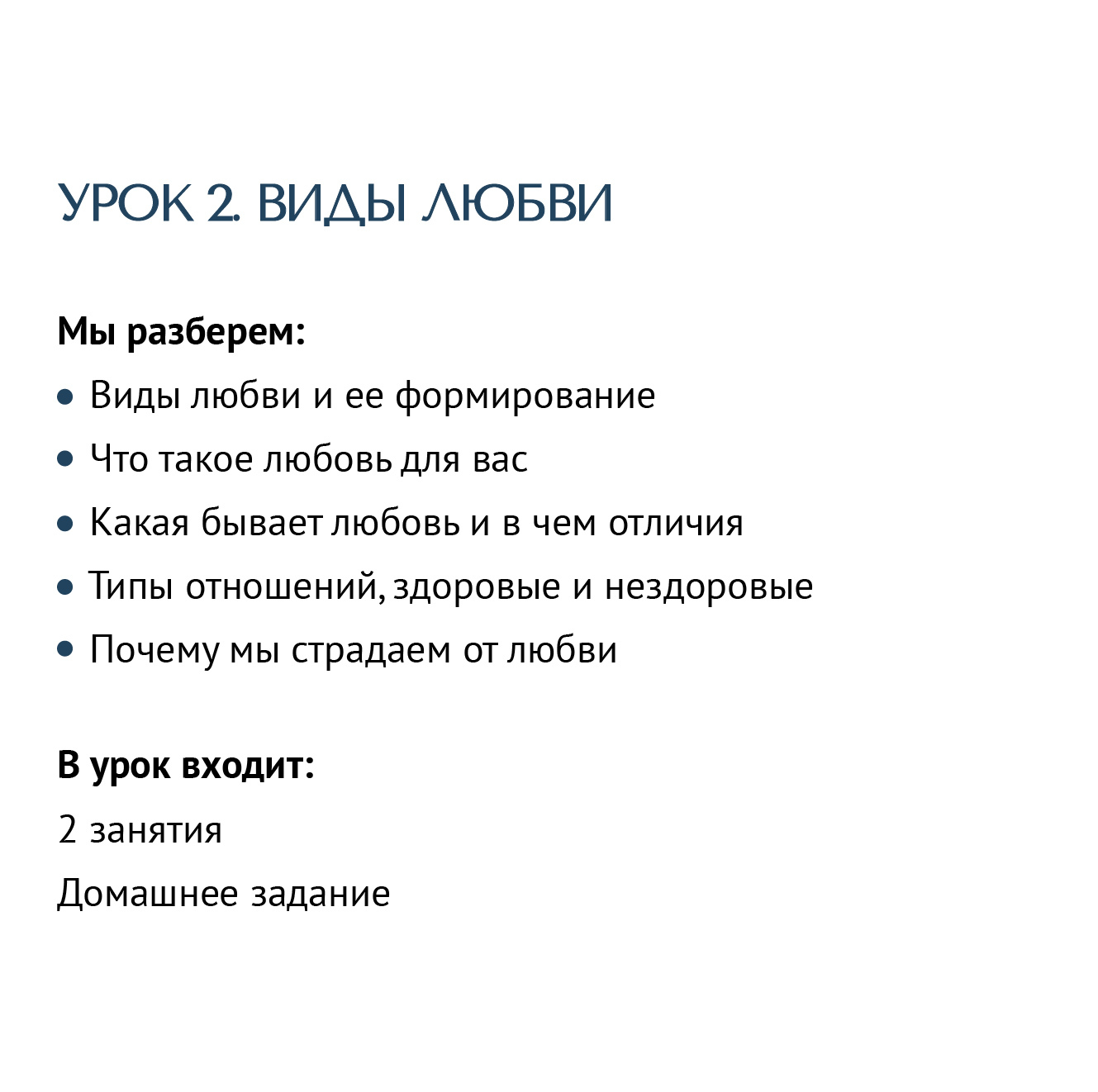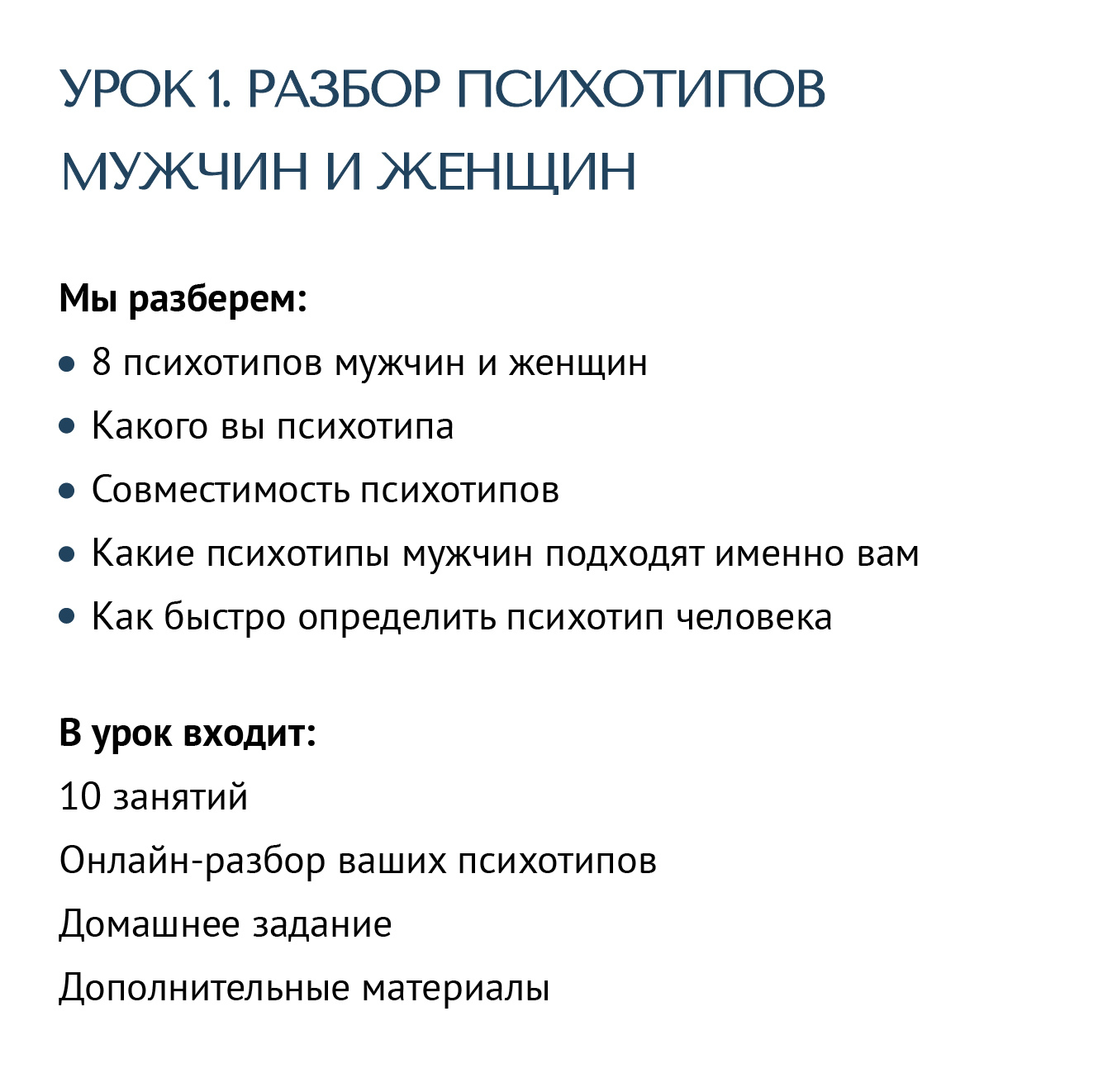 В урок входит: 2 занятия Онлайн-разбор ваших психотипов и психотипов ваши мужчин Домашнее задание