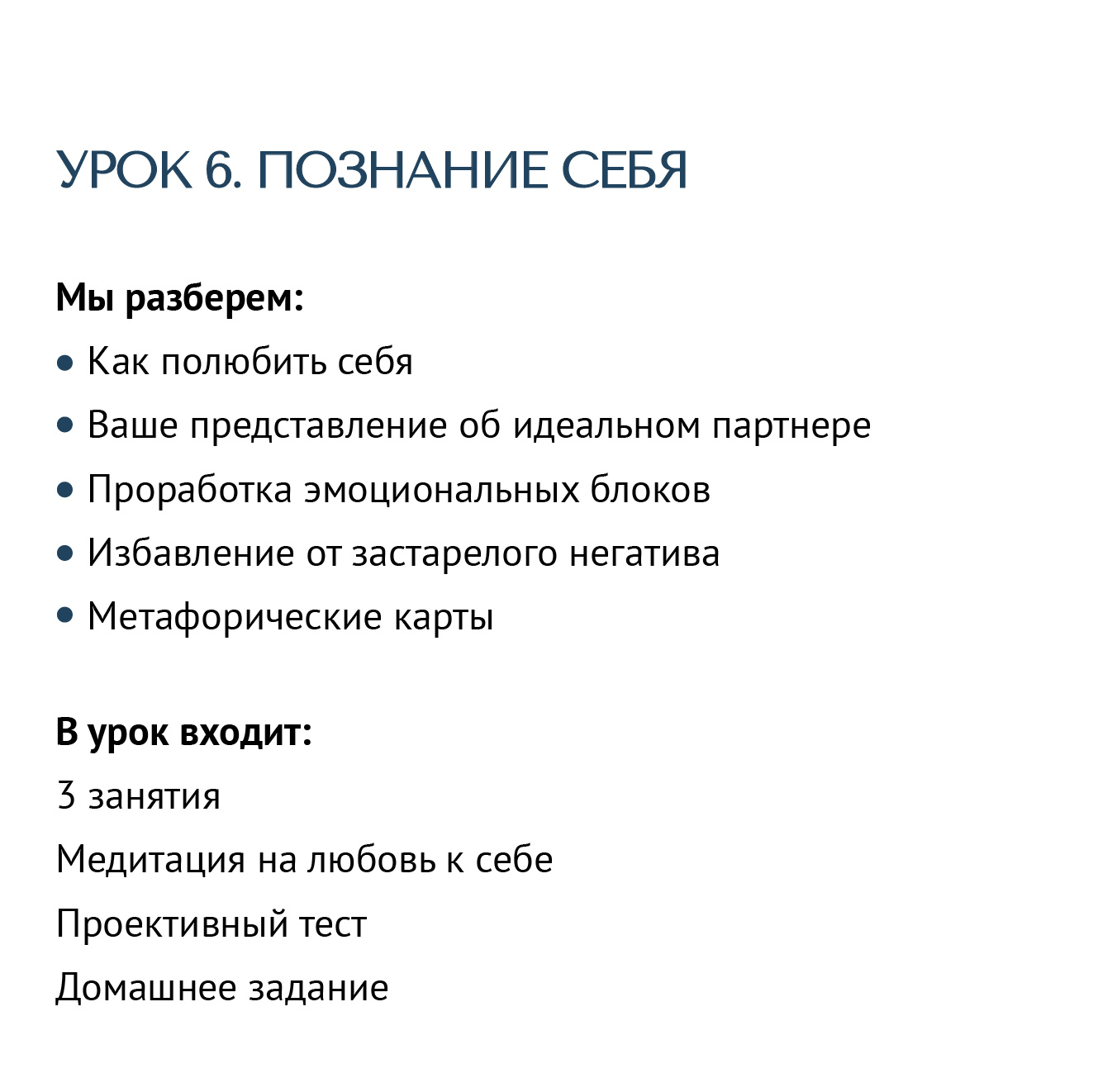 В урок входит: 3 занятия Медитация на любовь к себе Проективный тест Домашнее задание