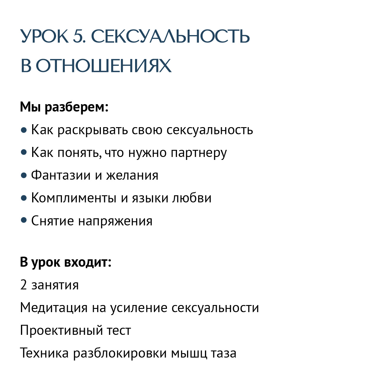 В урок входит: 2 занятия Медитация на усиление сексуальности Проективный тест Техника разблокировки мышц таза Домашнее занятие