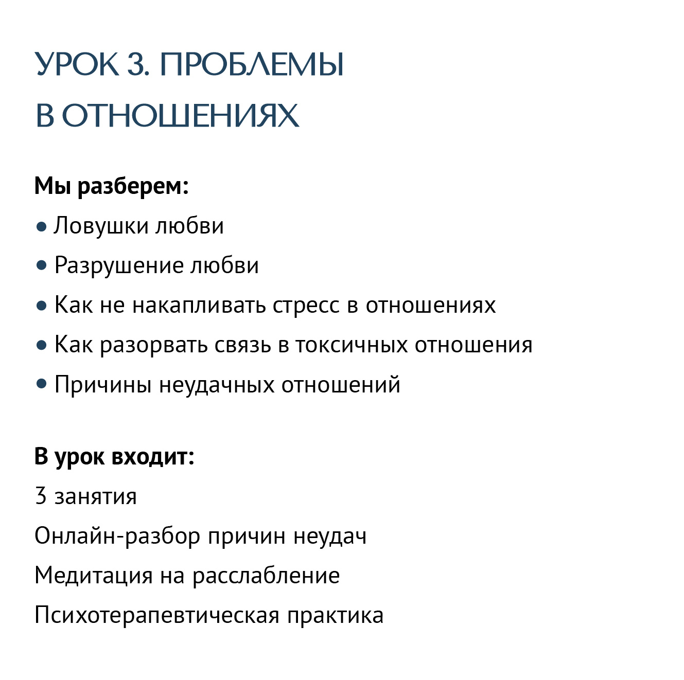 В урок входит: 3 занятия Медитация на расслабление Психотерапевтическая практика Домашнее задание